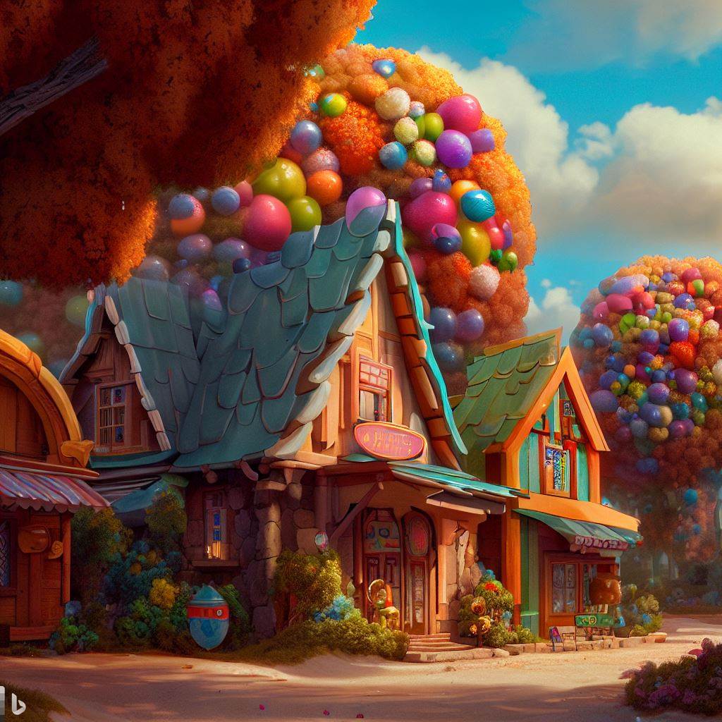 De prompt gaf ik in bij ChatGPT en het resultaat zie je eronder. Ik markeerde in geel welke stukken ik wilde gebruiken om een afbeelding te genereren en dat ging niet zoals verwacht. De eersten zagen er prima uit. Een dorp in kauwgomballenkleuren viel voor het ding best mee.