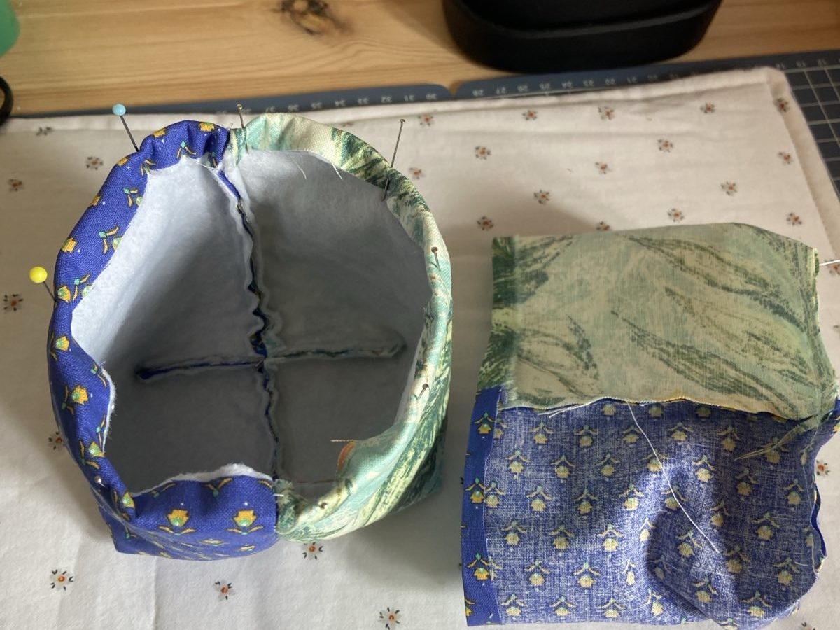 - Steek het tweede mandje in het eerste mandje. Zet het vast met spelden