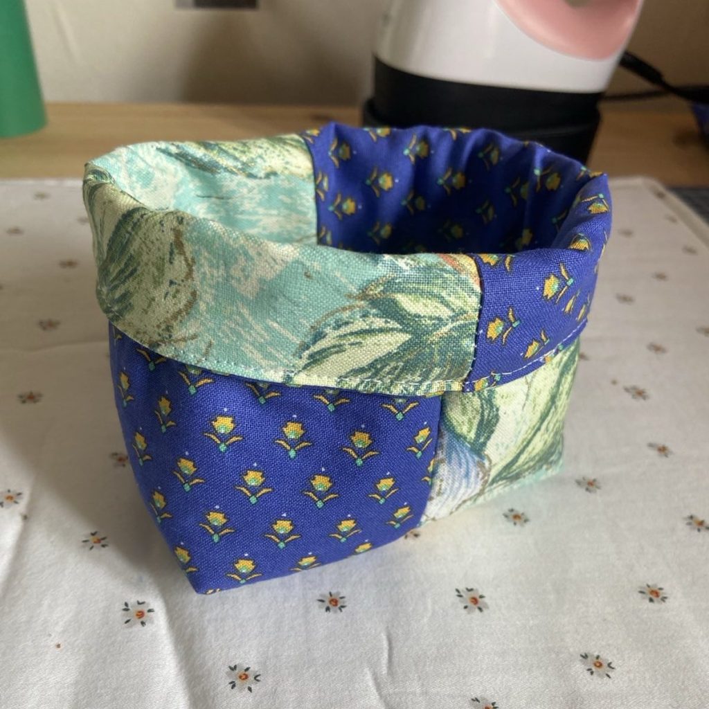 - 4 vierkantjes van 25 x 25 cm stof. Je kiest zelf welke. Op het voorbeeld zie je een mandje dat met 2 verschillende stofjes gemaakt is, maar je kan net zo goed vier verschillende vierkantjes maken