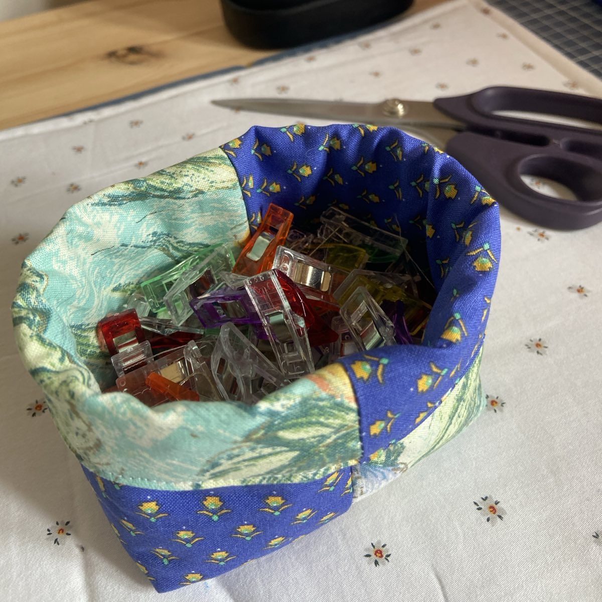 - 2 vierkantjes tussenstof. Afhankelijk van hoe stevig je de mandjes wil maken kan je diezen voor een dunne tussenstof of voor kleefbare fleece.